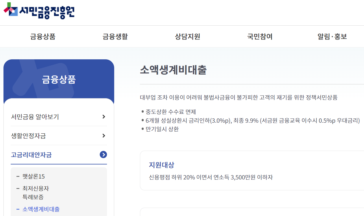 소액생계비대출은 제도권 금융과 기존 정책서민금융상품 이용이 어려운 이들에게 우선적으로 공급되며, 신용평점 하위 20% 이하이면서 연소득 3500만원 이하인 분들이 대상입니다.