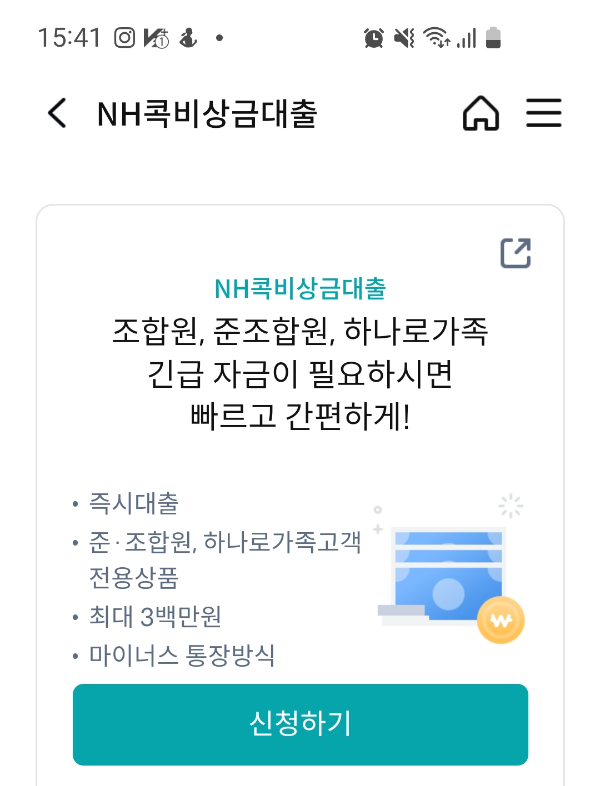 NH콕비상금대출은 모바일 뱅킹 앱인 NH콕을 통해 신청할 수 있으며, 농축협의 입출금 계좌를 가지고 있는 분들이 더욱 간편하게 이용할 수 있습니다.